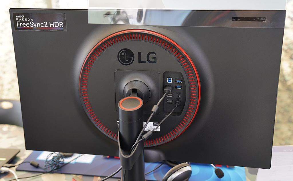 LG게이밍모니터의 특징인 후면의 동그란 레드문양을 볼 수 있습니다. 인터페이스를 보면, Type-B 인터페이스와 Display Port(DP포트), USB 3.1 포트x2와 HDMI단자x2, 오디오 단자를 지원합니다.