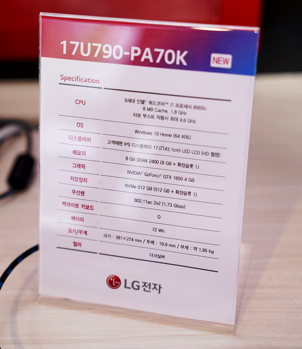 필자의 관심을 제일 먼저 끌었던 것은 바로 신제품 LG 울트라기어17 노트북이었습니다. 17U790-PA70K 모델명으로 출시된 LG 울트라기어17의 스펙은 인텔 8세대 CPU인 i7-8565U 탑재와 IPS 패널의 17인치 대화면에 WQXGA (2560X1600) 높은 해상도 적용과 NVIDIA 지포스 GTX1650 4GB 외장 그래픽카드를 탑재하고 있습니다.