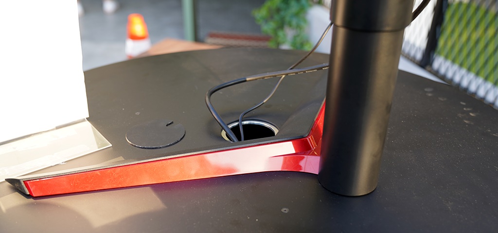 인상적인 모니터 받침대도 예사롭지 않다. 게이밍모니터답게 마치 태권도V를 연상하게 하는 강인한 레드V자를 볼 수 있었다.