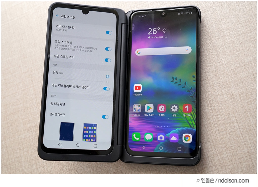 왼쪽에 있는 LG V50S 듀얼스크린2 와 오른쪽에 있는 LG V50의 듀얼 스크린을 비교해보면, 104도로 정해서 조정할 수 있는 한계를 벗어난 것을 알 수 있습니다. 이제 원하는 각도로 조정할 수 있습니다.