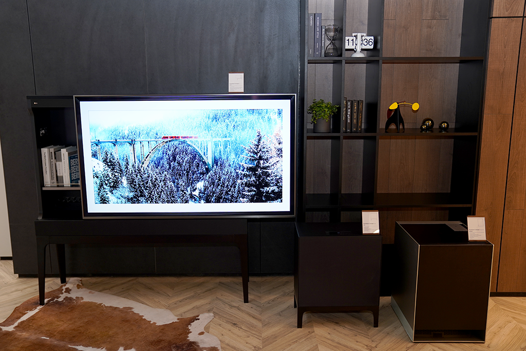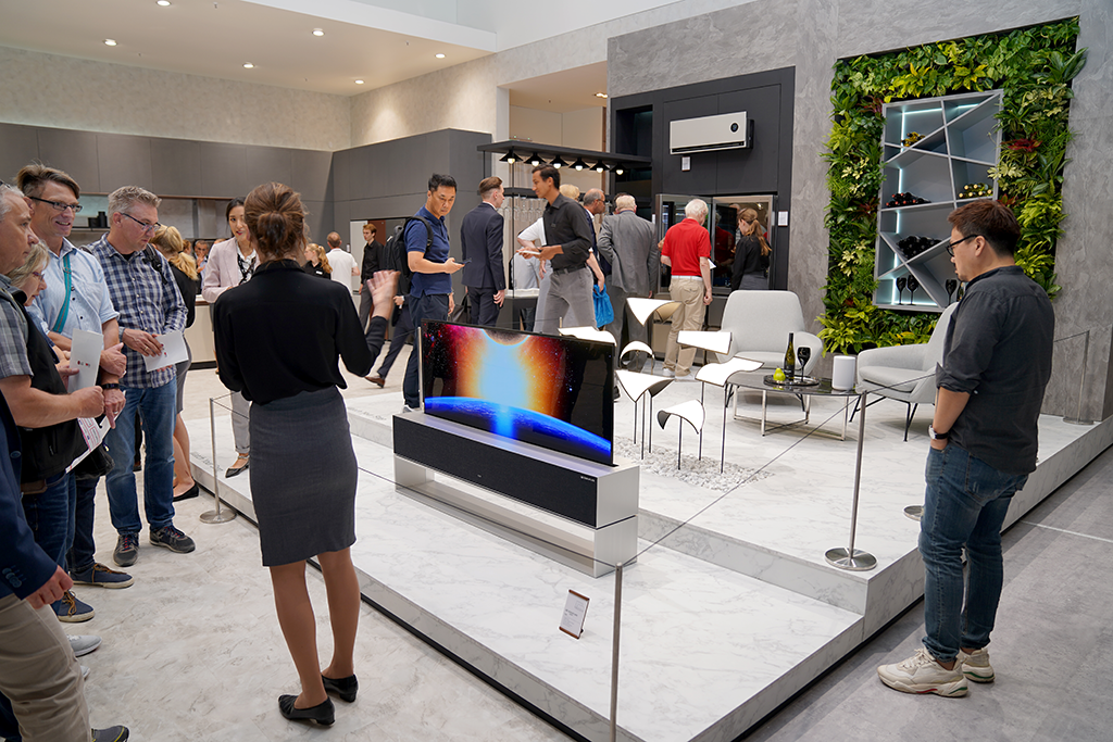 TV 시청이 끝나면 LG 시그니처 올레드 R을 제로뷰로 만들어 불필요하게 공간을 차지 않게 하여 어느 공간이나 잘 어울리게 만들어 줍니다. 제로뷰로 내려가면 공간의 경계가 없어져 리빙과 홈바 공간이 연결되는 시원한 모습도 볼 수 있었습니다.