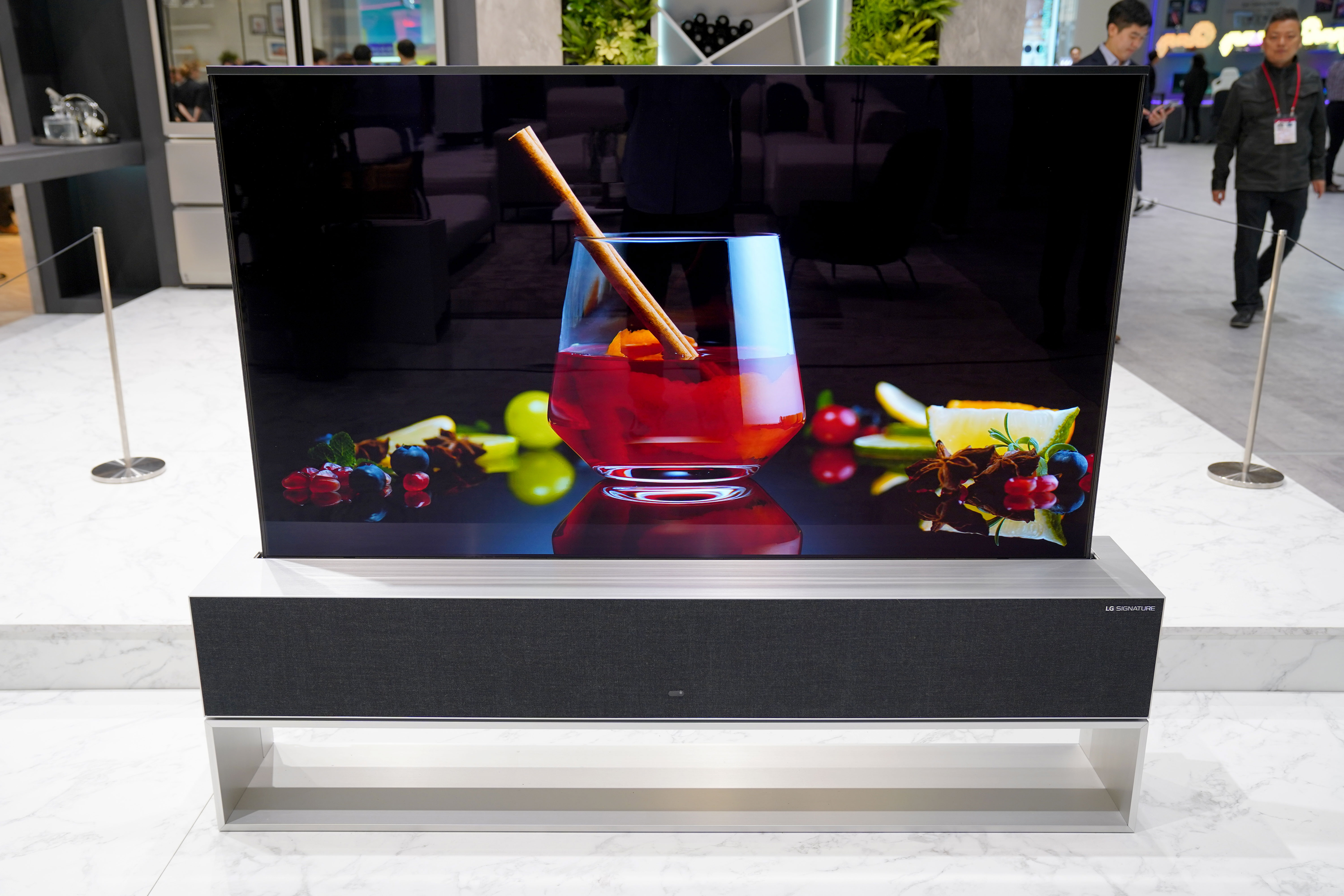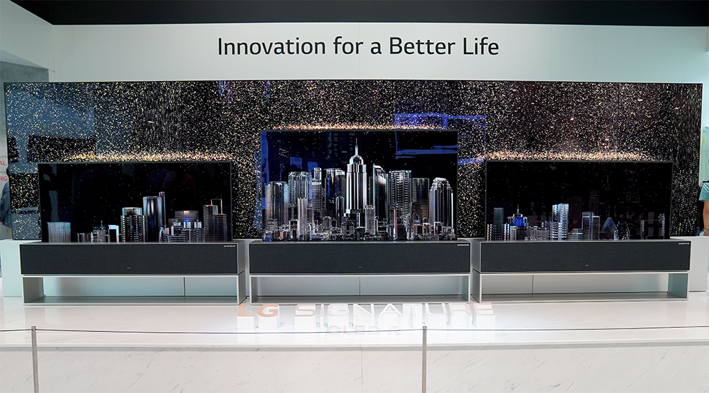 2019 CES에서 최고의 혁신상을 수상한 LG 시그니처 올레드 R은 휘어도 되는 올레드의 특성으로 말려서 들어가 있다가 TV보기를 원할 때 펼쳐서 시청이 가능합니다.