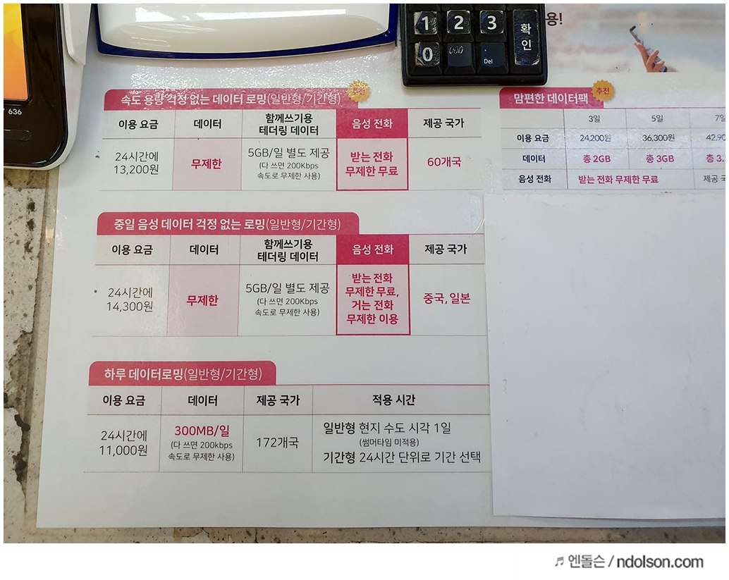 인천 국제공항에서 LG 유플러스 매장을 찾아 해외 데이터로밍을 하였습니다. 친절하게 직원분이 날짜 계산을 해서 유리한 조건으로 요금제를 선택해주셨습니다. 경유지까지 여행기간 계산하기 힘든데 알아서 해주셔서 너무 고맙더라고요.