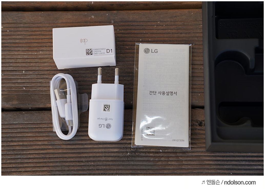 LG Q70 스마트폰의 구성품을 보면, 번들 이어폰, USB-C 케이블, 고속충전 어답터, 간단 사용설명서로 구성되어 있습니다.