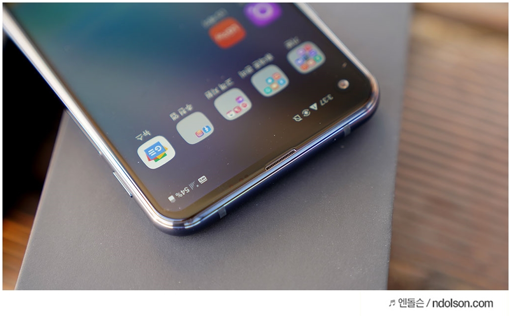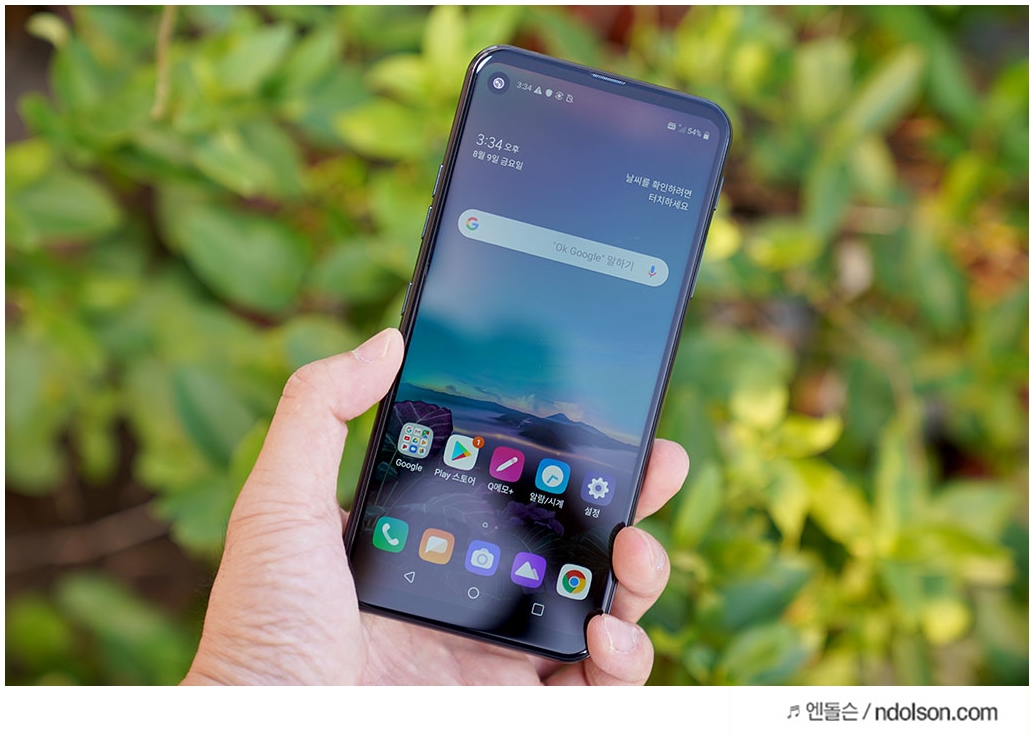 LG Q70 을 켜보았습니다. 화면이 더 크게 느껴 지는 것은 홀인 카메라 덕분인 것 같습니다. 노치 디자인을 싫어하시는 분에게는 홀인 디스플레이가 좋을 것입니다.