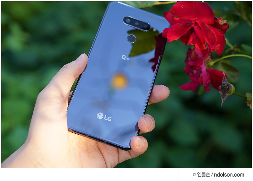 이건 정말 잘했습니다. 블링블링한 첫느낌이 너무 좋았습니다. LG Q70 의 후면은 미러 효과가 멋집니다. 장미꽃 옆에 두면 비치고 빛에 따라 반짝이는 느낌이 좋습니다.