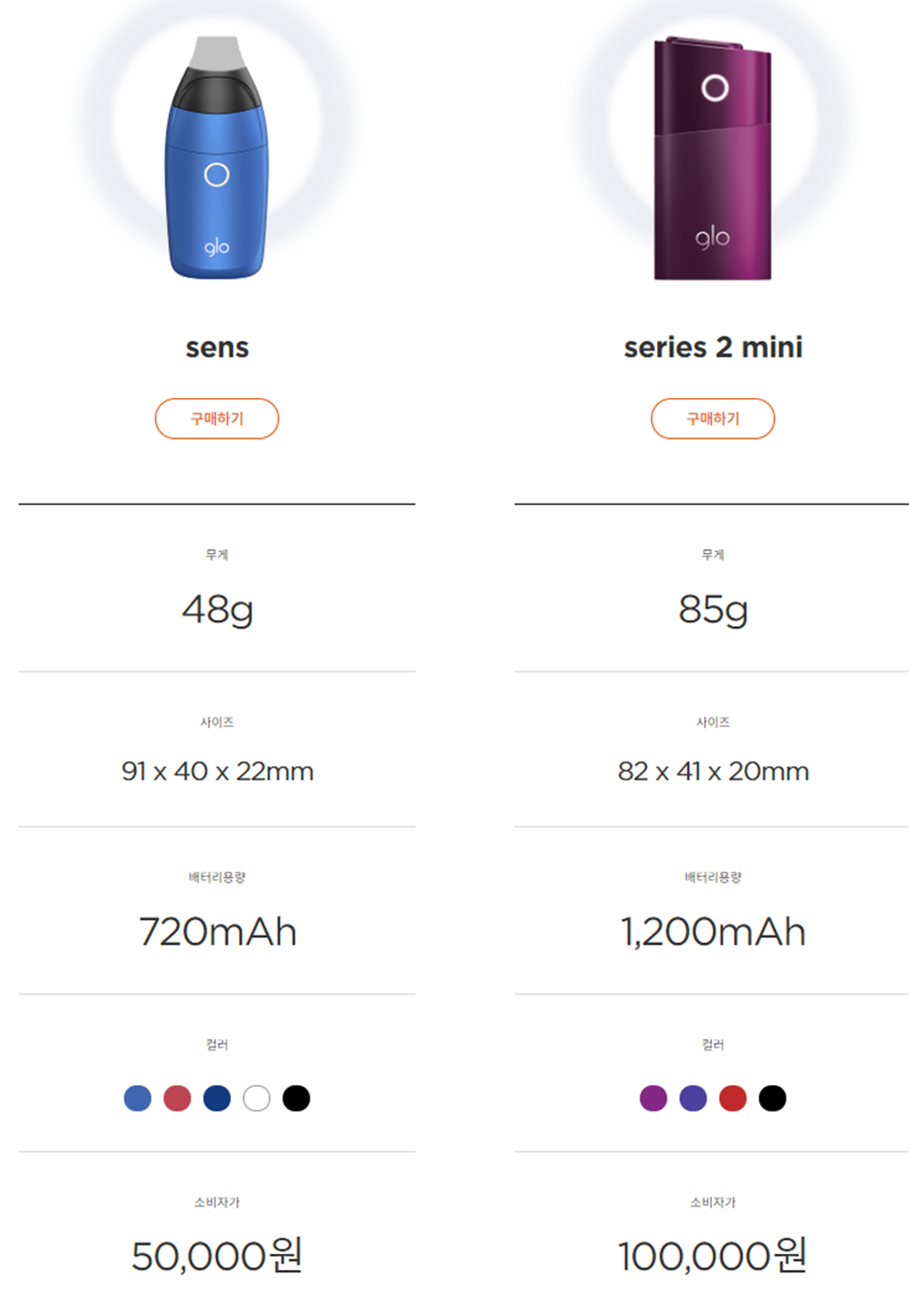 이전에 출시된 글로 시리즈2 미니와 비교해도 가볍고 가격도 부담스럽지 않게 1/2입니다. 대시 배터리 용량이 작고 액상형이라 차이가 있습니다. 글로 센스 제품 스펙을 참고하세요!