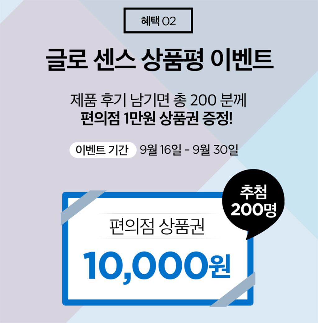 또 글로 센스 상품평 이벤트도 진행하고 있으니 구매 후 참여해보시면 좋습니다. 편의점 상품권 1만원건을 200명 추첨을 통해서 준다고 합니다. 후기 이벤트로 해보세요.
