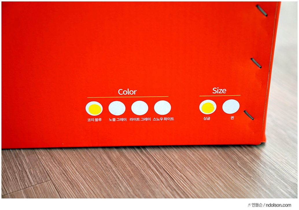 전기매트 사이즈는 싱글/퀸이 있고, 색상은 4가지로 코지블루, 노블 그레이, 라이트 그레이, 스노우 화이트가 있습니다. 장모님 한분만 주무실 걸로 싱글에 세련된 코지블루로 선택했습니다.