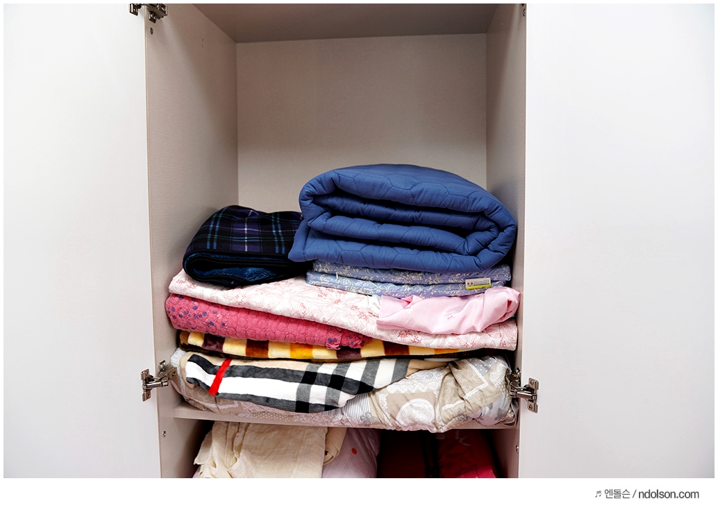 침대 위에 두어도 되고 보관을 위해서 이렇게 장롱에 수납도 가능합니다.