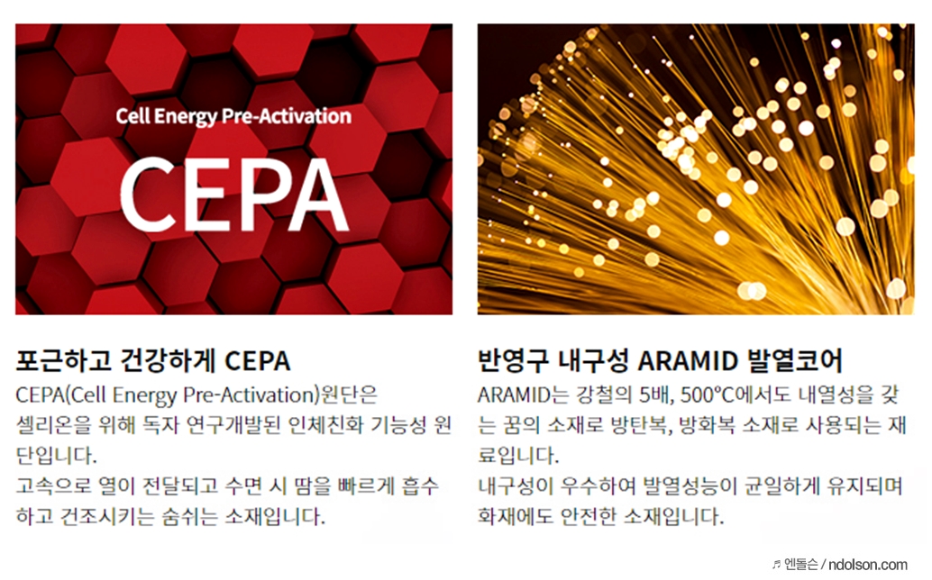 포근하고 건강하게 해주는 CEPA(Cell Energy Pre-Activation) 원단으로 셀리온이 독자 연구개발한 인체친화 기능성 원단이 사용되었습니다. 열을 고속으로 빠르게 전달하고 수면 시 흐르는 땀도 빠르게 흡수하고 건조하는 숨쉬는 소재라고 보시면 됩니다.