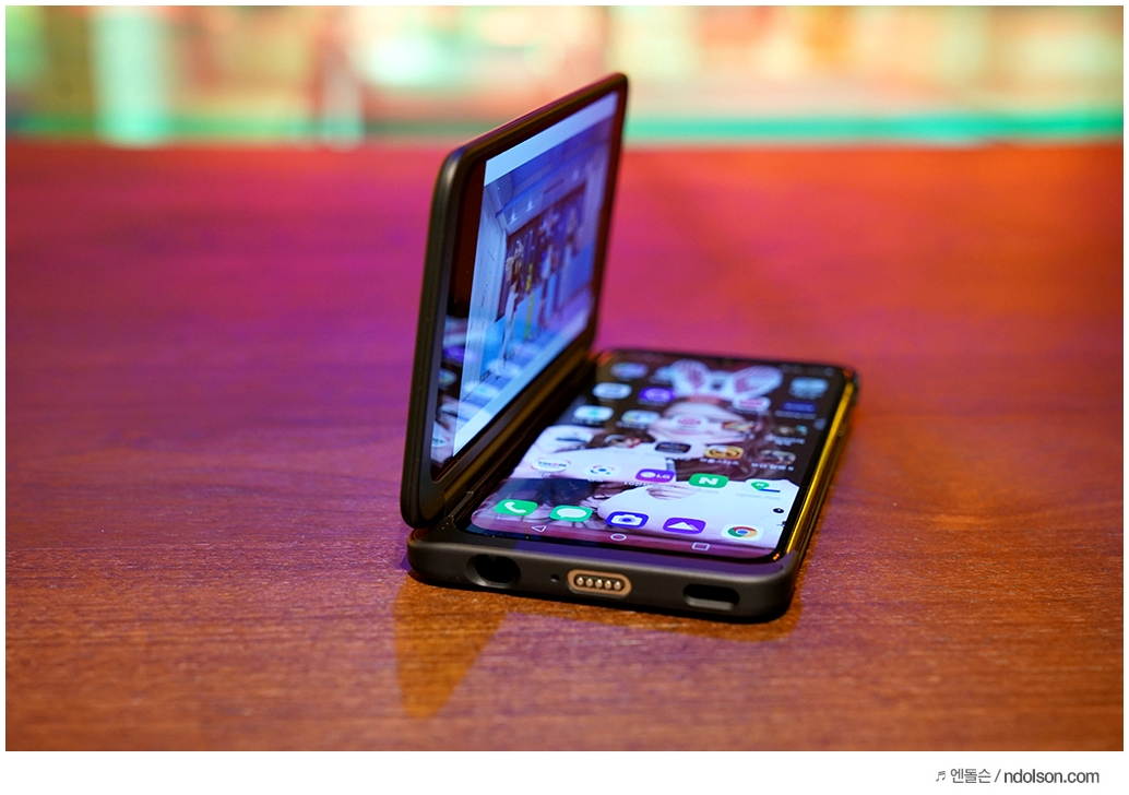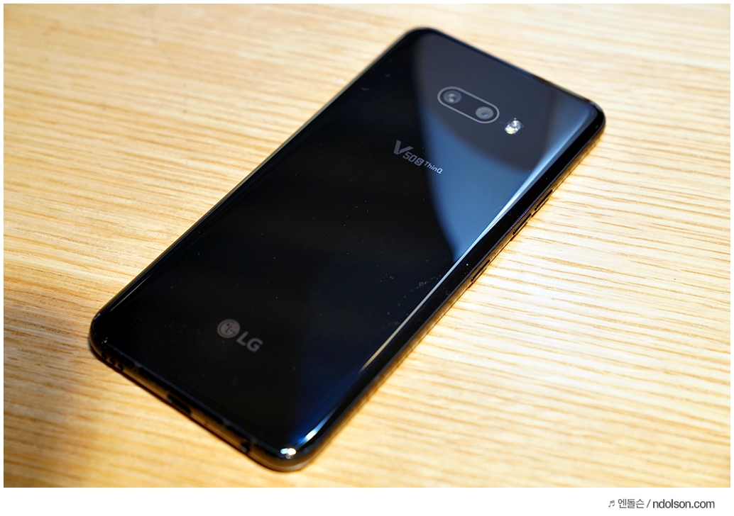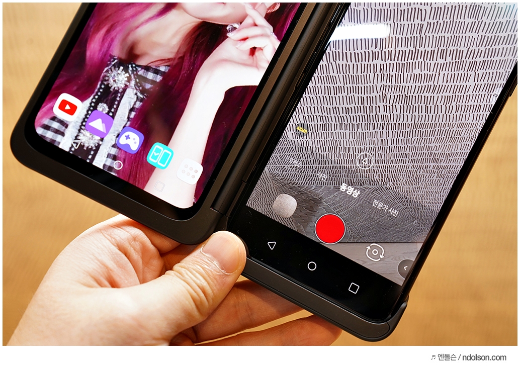 LG V50S ThinQ는 조금 더 가벼워졌고 전체적인 마감가 힌지 부분의 디자인이 더욱 세련되어졌습니다. 가장 먼저 눈에 띄는 것은 후면에 엠보싱이 들어간 부분이 감촉이 더 좋아졌습니다.