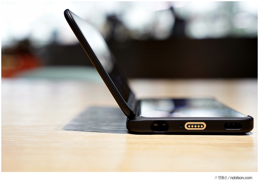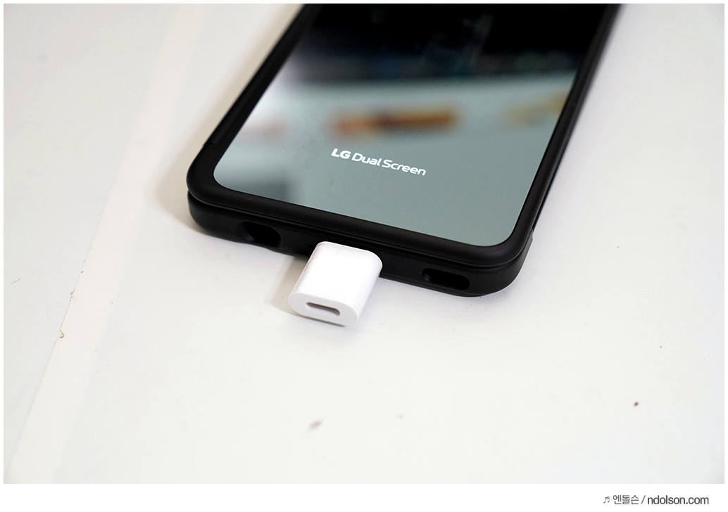 또 듀얼스크린 충전부는 포고핀(Pogo pin) 대신 USB 타입으로 변경되었습니다. 연결 방식을 USB 타입으로 변경하여 후면 디자인에 충전부가 들어 나지 않아 디자인상 일체감이 좋아졌습니다. 아쉽게도 LG V50에는 듀얼스크린2가 호환이 안됩니다. 억지로 끼워지기는 하지만 듀얼스크린 2는 동작하지 않습니다.