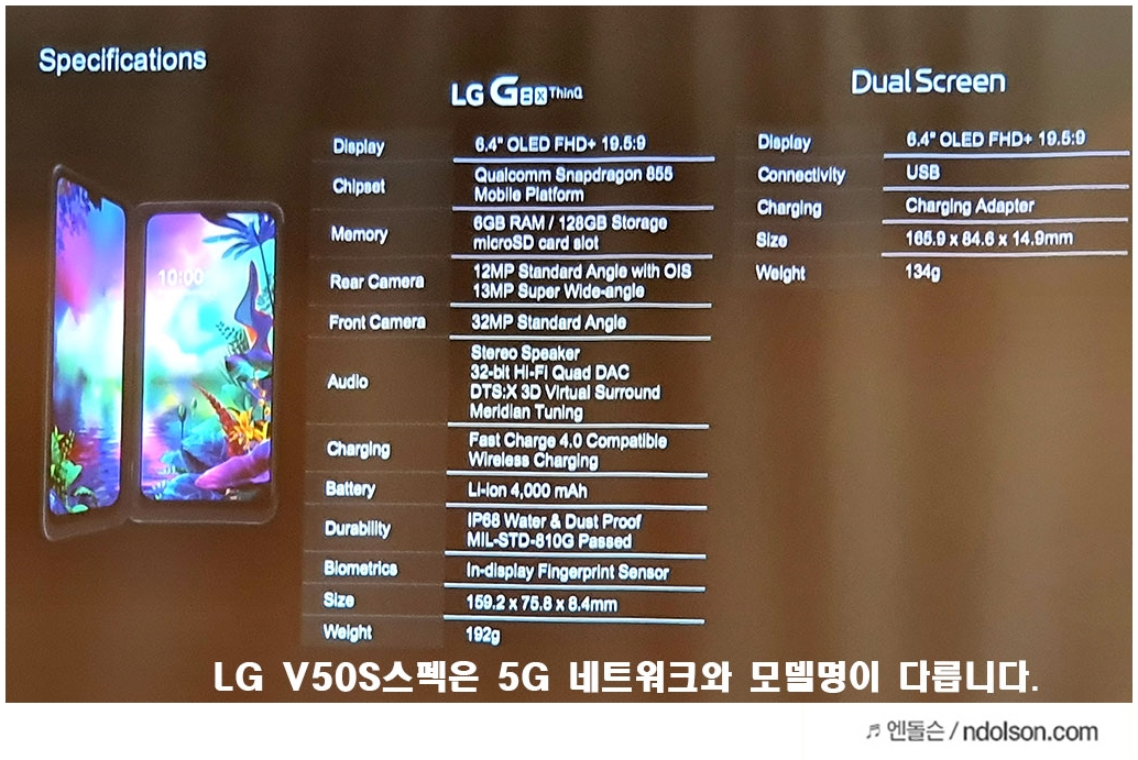 이번 LG V50S 씽큐 스펙을 보면 6.4인치 OLED FHD+ 19.5:9 디스플레이가 사용되었습니다. 이는 듀얼스크린도 동일합니다. 또 퀄컴 스냅드래곤 855가 사용되었으며 RAM 8GB, ROM 256GB가 탑재되었습니다. 램이 6GB에서 8GB로 늘었습니다. 무게는 192g으로 여전히 가볍습니다.