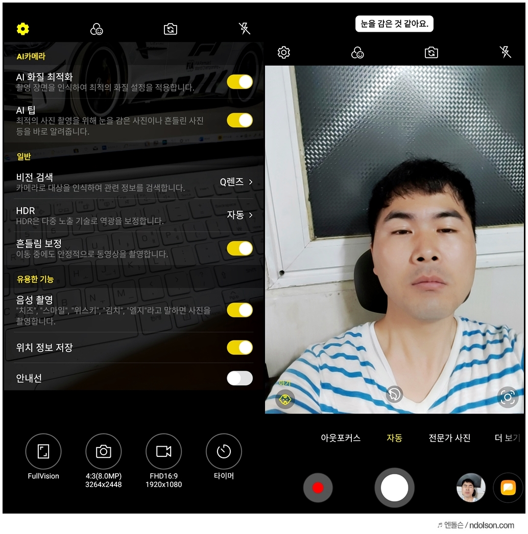 LG Q70 씽큐의 AI 팁 기능을 활성화하면 눈을 감았다던지 흔들렸다는 것을 사용자에게 알려줍니다. 혹시나 사진이 흔들렸나 다시 찍어야 하나 몰랐을 때 알려주니 좋네요.