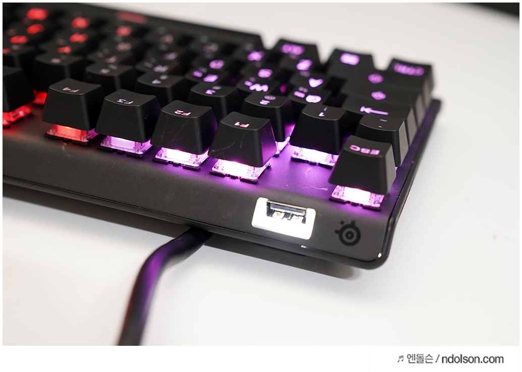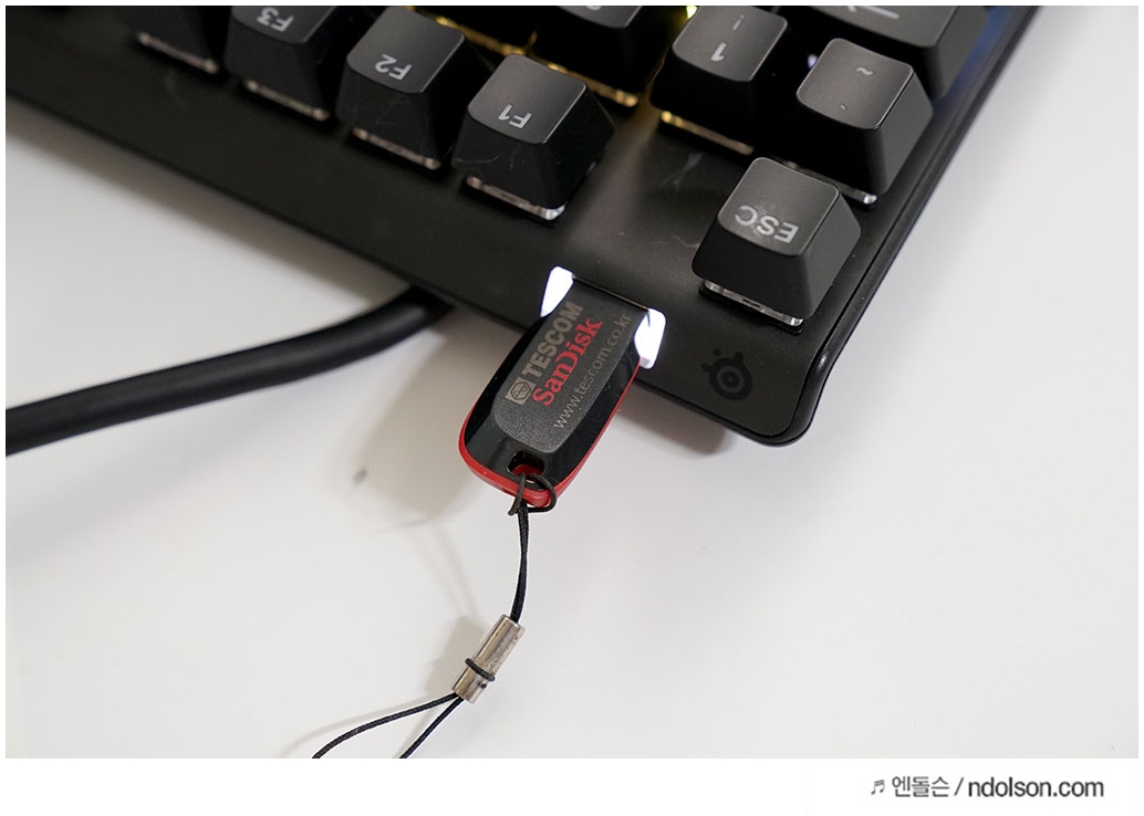 USB 저장장치를 키보드에 연결하여 바로 사용할 수 있게 APEX PRO 게이밍키보드는 USB 패스스루 포트를 제공합니다. 빠르게 USB 메모리 스틱을 연결하기 좋습니다.