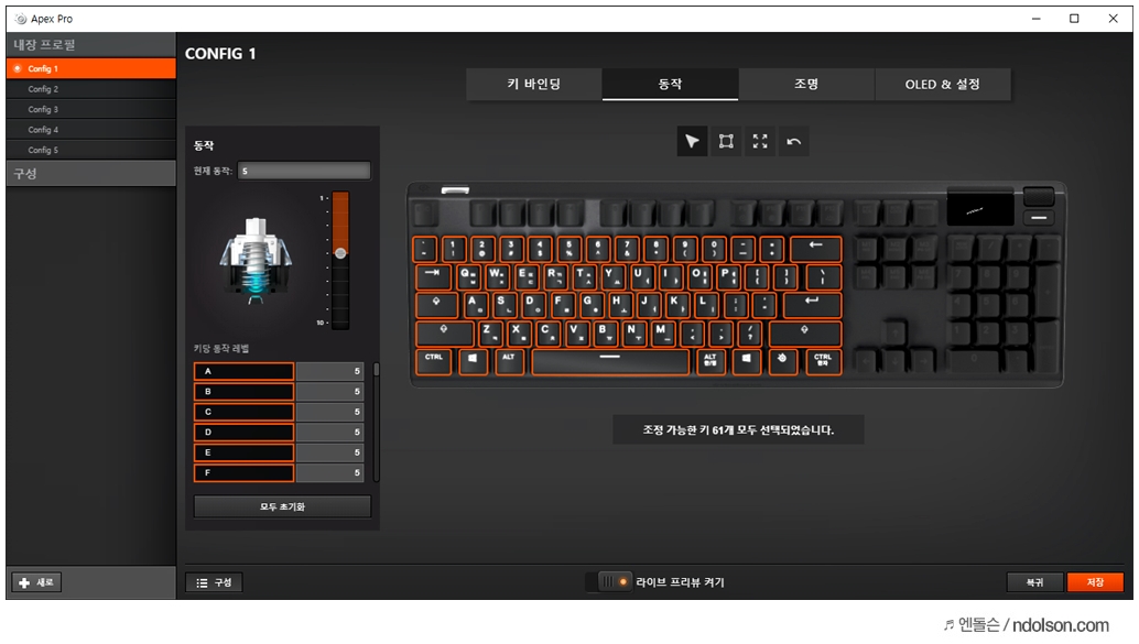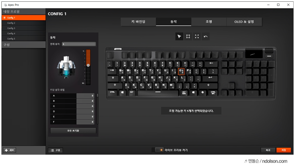 또 키보드의 키별로 키 누르기 감도를 조절할 수 있습니다. 게임할 때 O 키를 자주 누르는데, 감도 조절을 통해서 개인신체조건에 적합한 선호도 세팅이 가능한 것이죠.