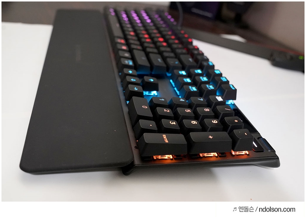 키보드 손목 받침대는 붙이고 떼고 마음대로 할 수 있습니다. 자석으로 되어 있어 손쉽게 붙일 수 있었었는데, 키보드를 자주 치는 직업이 있어 손목 받침대 액세서리는 참 좋더군요.