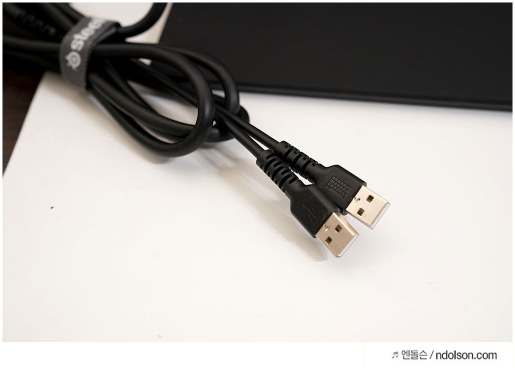 게이밍 키보드 연결선이 2개입니다. USB 패스스루 포트를 사용할 수 있게 컴퓨터와 연결이 됩니다.