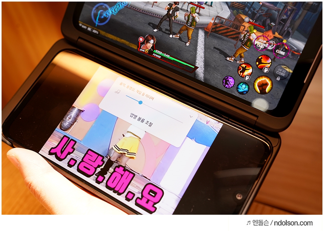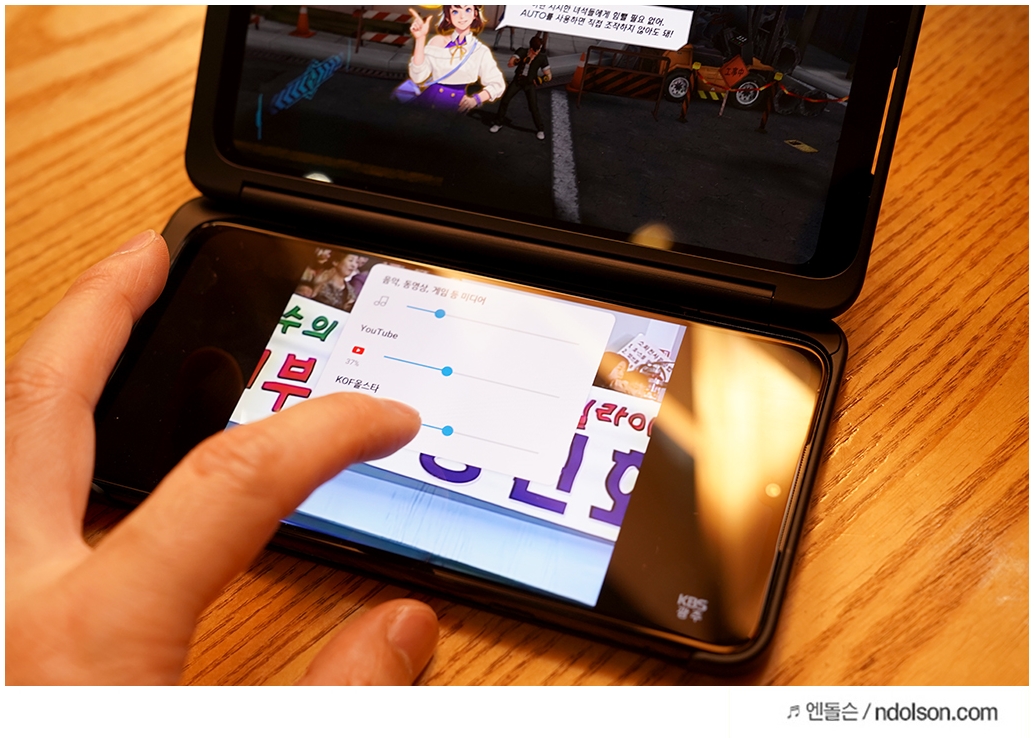 V50S 듀얼스크린으로 딸아이와 함께 스마트폰을 쓸 때는 좋습니다. 이렇게 양쪽 화면을 기울여서 볼 수 있어서 좋습니다. 180도 화면 회전을 통해서 서로 다른 화면을 볼 수 있는 건 꿀팁입니다. 아빠는 킹 오브 파이터 게임하고 딸아이는 유튜브 보네요!