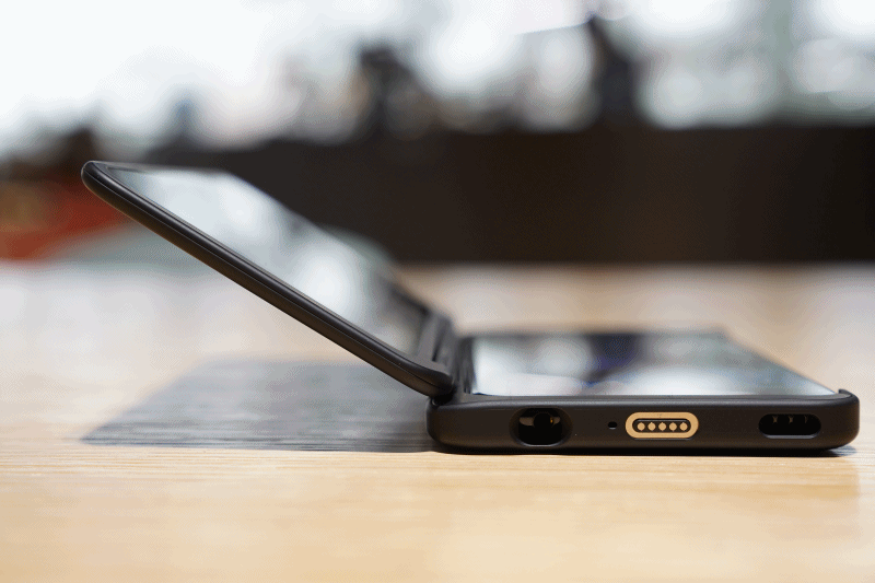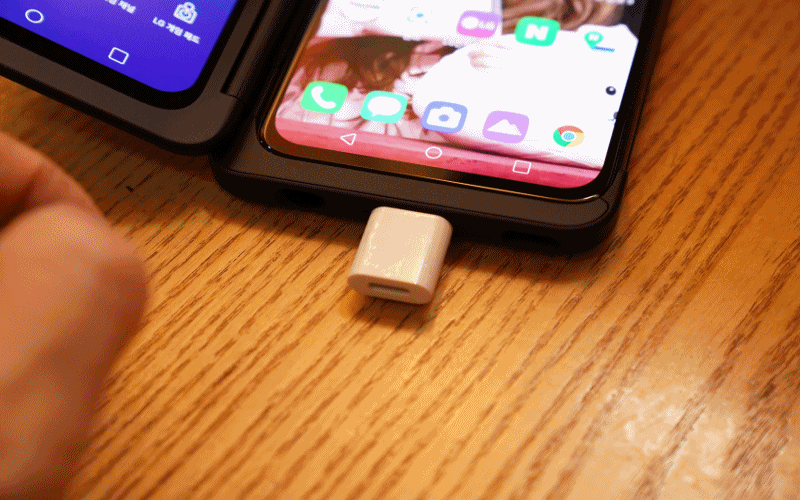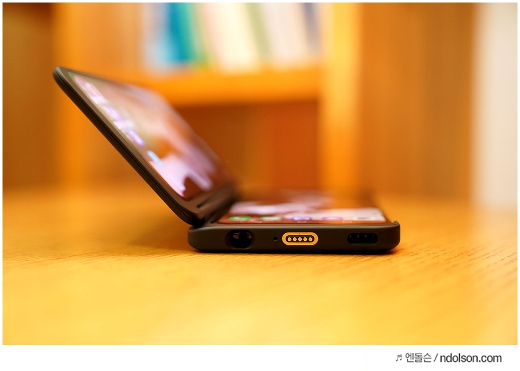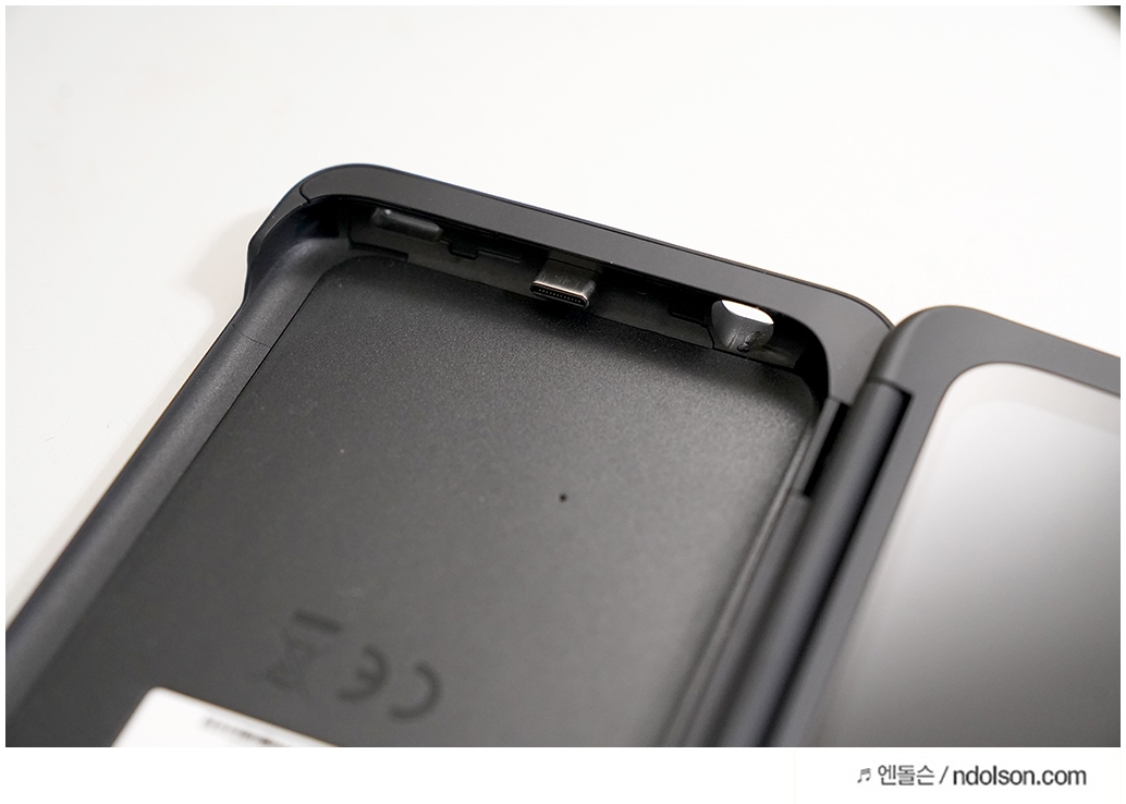 듀얼스크린 안쪽은 USB-C 단자로 변경되었습니다. 기존 포고핀(Pogo pin) 대비 미세한 지연과 배터리 절감을 가져왔습니다. 큰 차이는 V50S 후면에 포고핀 부분이 없어 디자인이 깔끔해졌습니다.