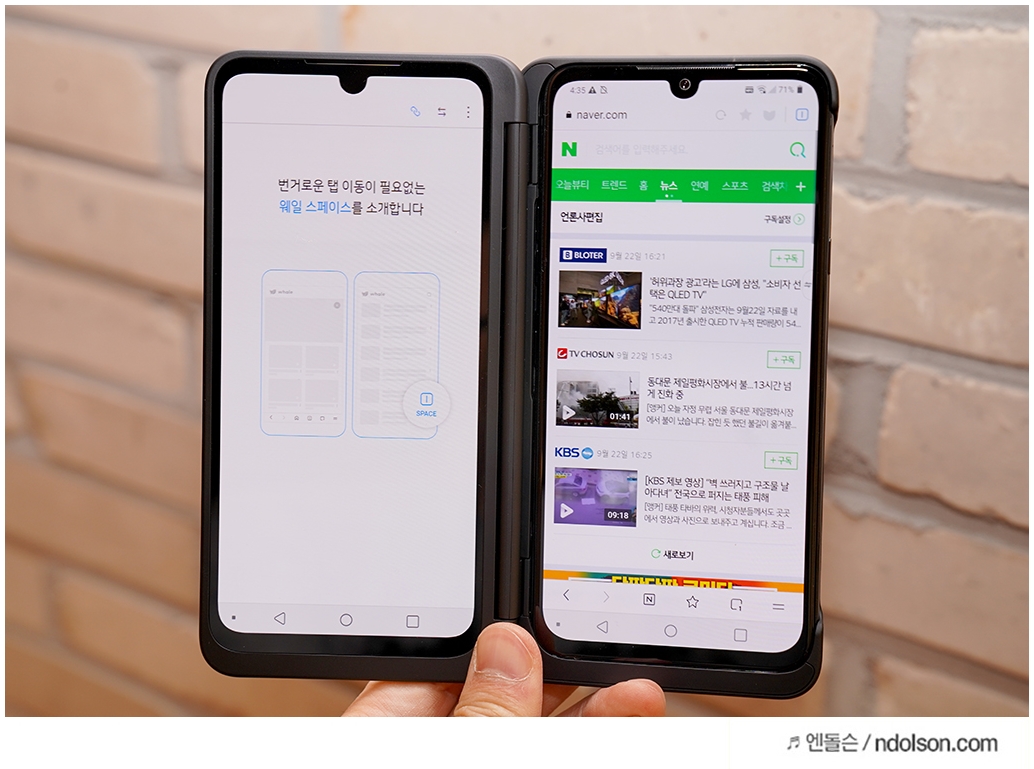 웨일 스페이스는 웹 브라우저에서 메뉴를 클릭하면 듀얼 스크린에 화면이 바로 나옵니다. 웹서핑을 볼 때 클릭하고 뒤로 가기를 눌렀는 데, 이제 그럴 필요가 없습니다. 네이버 웨일 브라우저 앱의 웨일 스페이스를 켜 두면, 클릭한 기사가 듀얼스크린에 표시되어 보기 편합니다.
