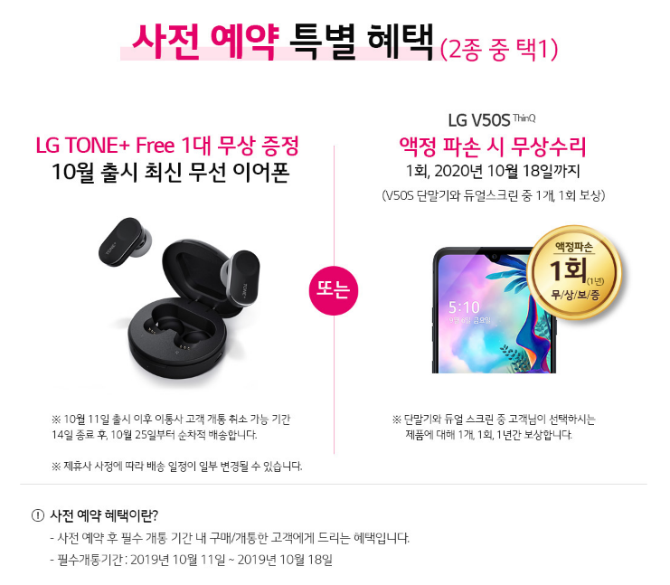 이번 LG V50S 씽큐의 사전예약의 혜택은 크게 2가지입니다. LG전자의 신제품 LG TONE+Free 1대 또는 액정 파손 수리 중 택1을 할 수 있습니다.