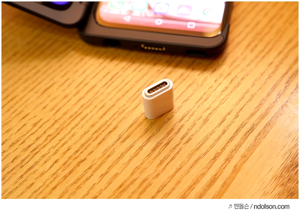 듀얼스크린은 마그네틱 자석의 젠터가 사용됩니다. 호불호가 나뉠 수 있는 데, 자석 케이블을 사용하셨던 분이라면 쉽게 붙이고 뗄 수 있다는 점에서 좋을 수 있습니다. 반대로 듀얼스크린 전용 젠더를 잃어버릴 수 있어서 불안할 수 도 있습니다.