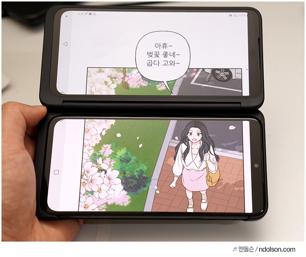 요즘 웹툰 보는 기안84의 복학생을 보면 서른살의 초등학생 치고받고 싸움박질을 보는 재미가 쏠쏠하더군요. V50의 듀얼스크린의 양쪽 화면으로 크게 보면 더 웹툰 보기는 좋습니다.