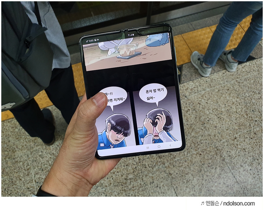 출근, 퇴근하는 지하철에서 손잡이도 잡아야 하니깐, 갤럭시 폴드를 접었습니다. 4.6인치의 작은 화면이지만, 웹툰을 보거나 웹서핑, 카톡 보기 등으로는 적응하면 괜찮습니다.