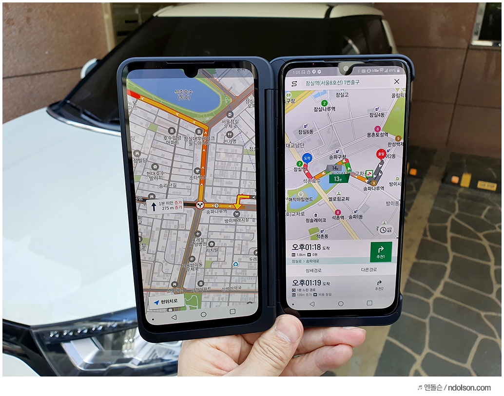 또 이렇게 펼치면 양쪽을 쓸 수 있는데, 이번에 재미 삼아서 내비게이션을 V50S 양쪽에 띄워 보았습니다. 이렇게 운전하면서 쓰지는 않지만, 카카오 내비게이션이 빠른 지, 원 내비가 빠른지 살펴보았습니다. 개인적인 생각에 내비게이션도 듀얼 앱이 지원되는 어플이 나왔으면 좋겠네요.