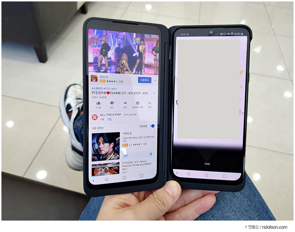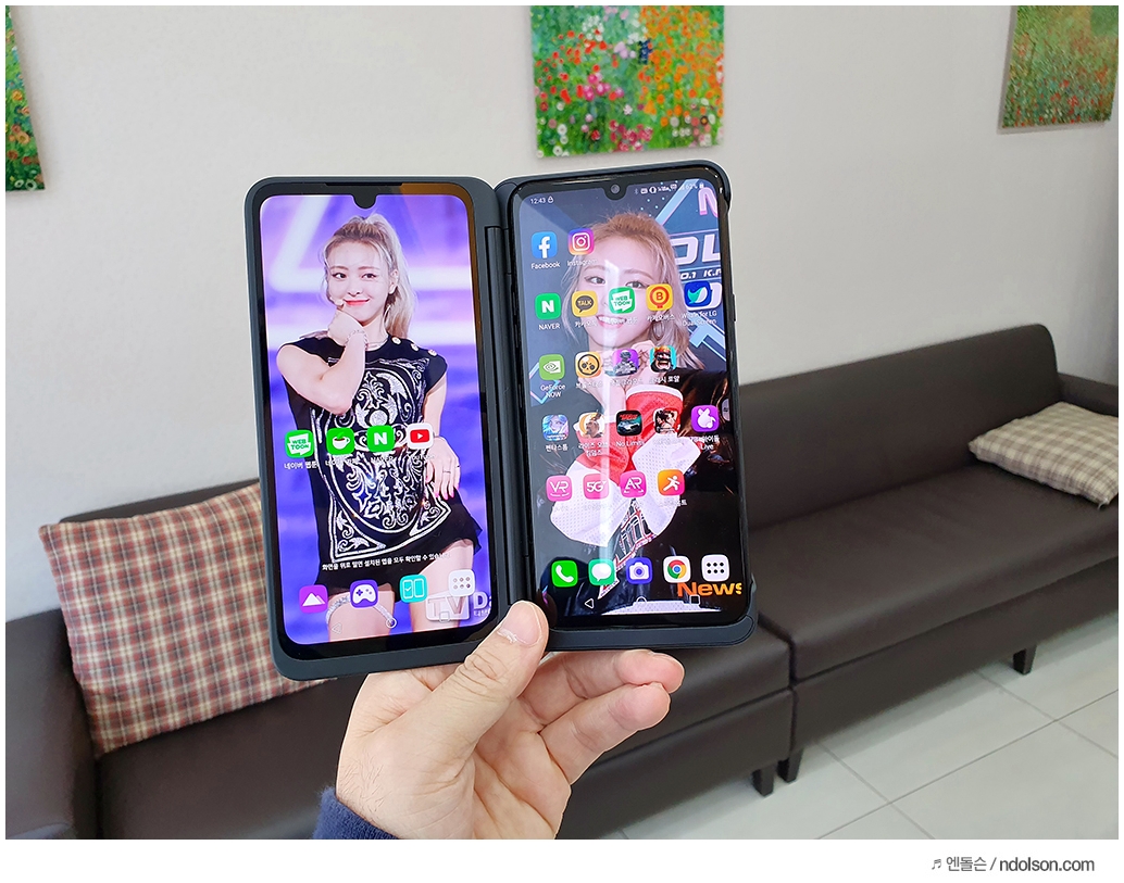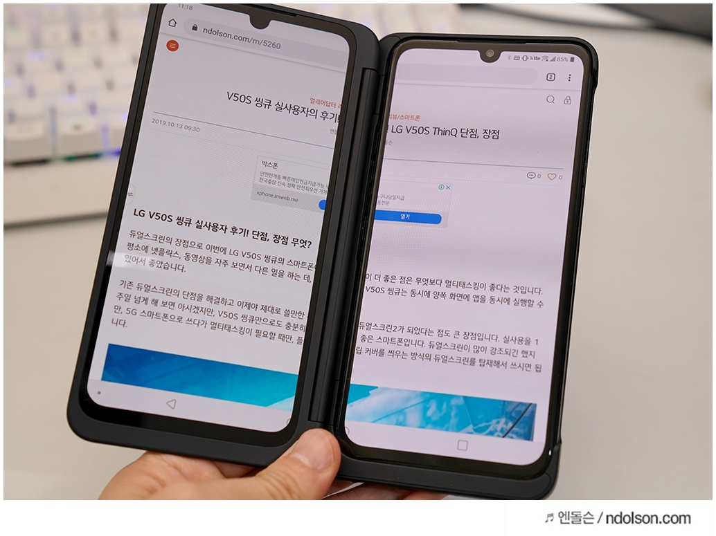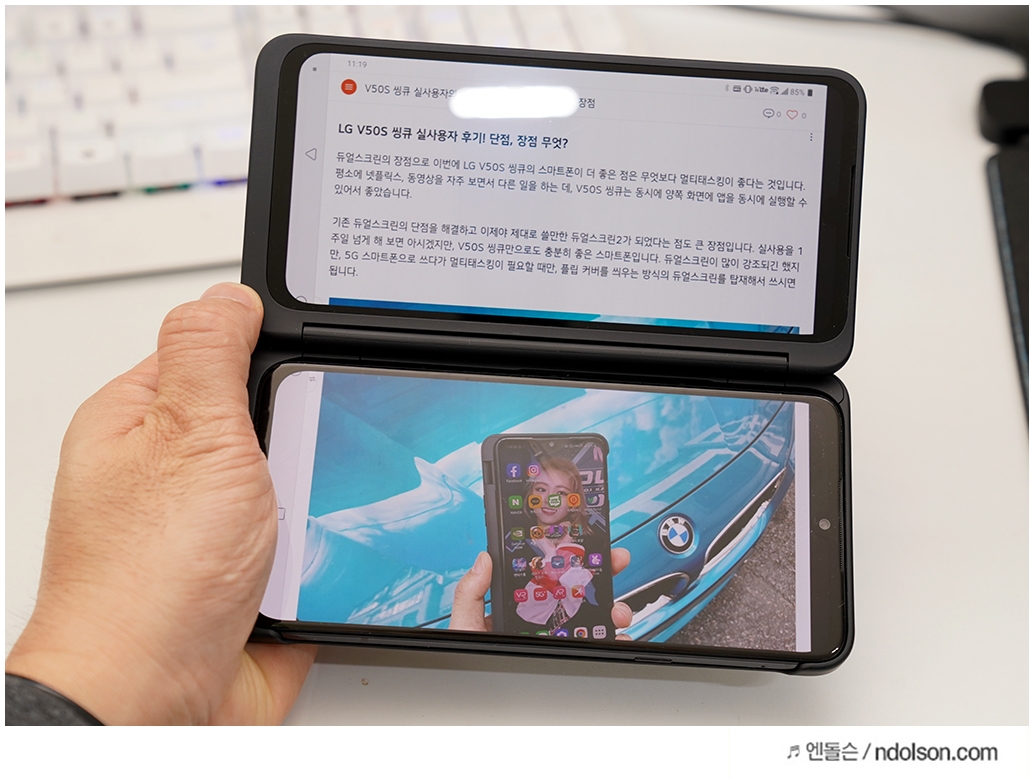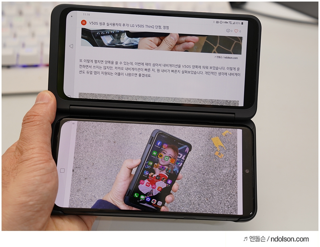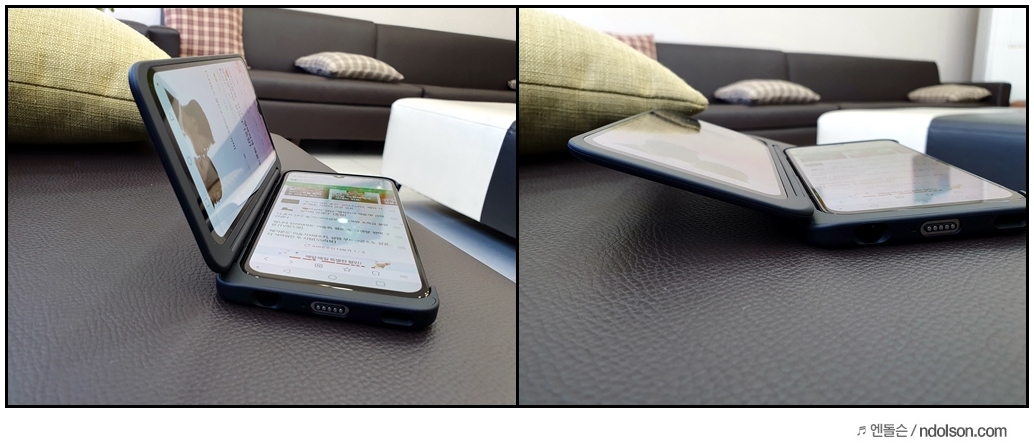 또 재미있는 건 V50S ThinQ의 양쪽 화면을 모두 보이게 해 줄 수 있다는 것입니다. 이건 대박 신기하던데요. 사실 가운데 좀 선이 걸리적거리긴 하지만, 세로 아닌 가로로 두면 또 괜찮습니다.