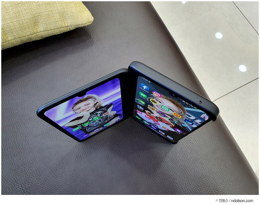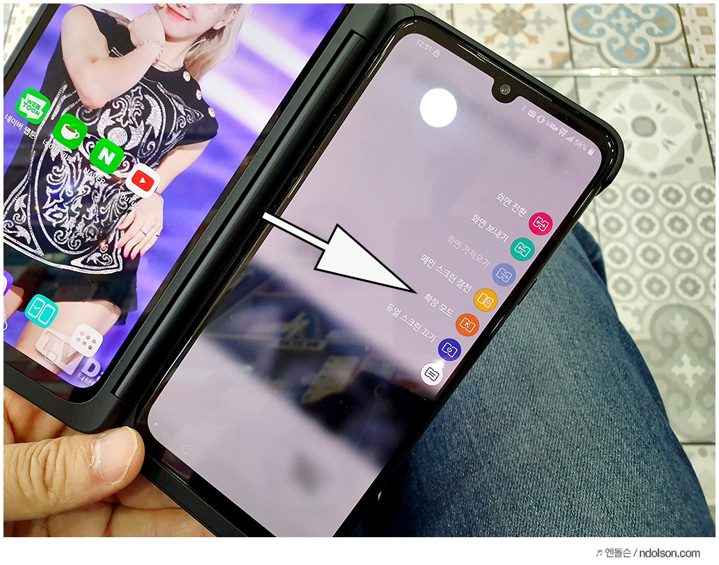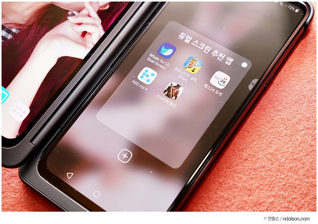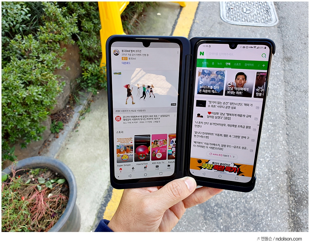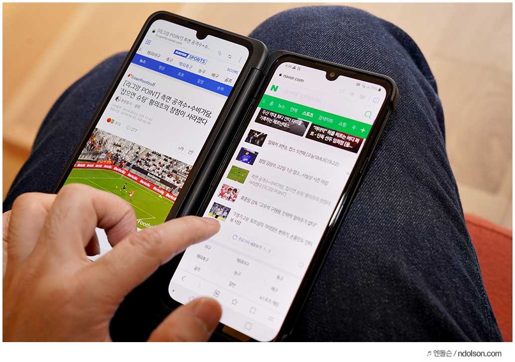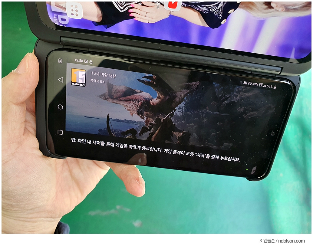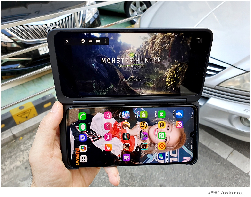 또 재미있는 건 V50S ThinQ의 양쪽 화면을 모두 보이게 해 줄 수 있다는 것입니다. 이건 대박 신기하던데요. 사실 가운데 좀 선이 걸리적거리긴 하지만, 세로 아닌 가로로 두면 또 괜찮습니다.