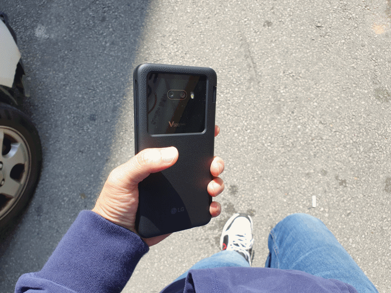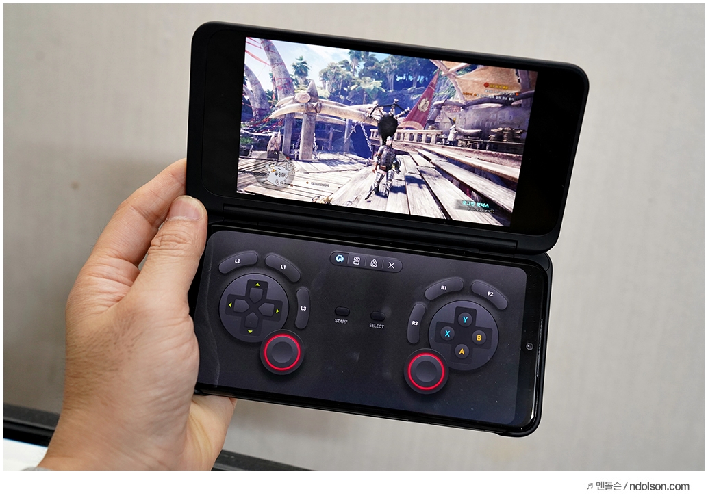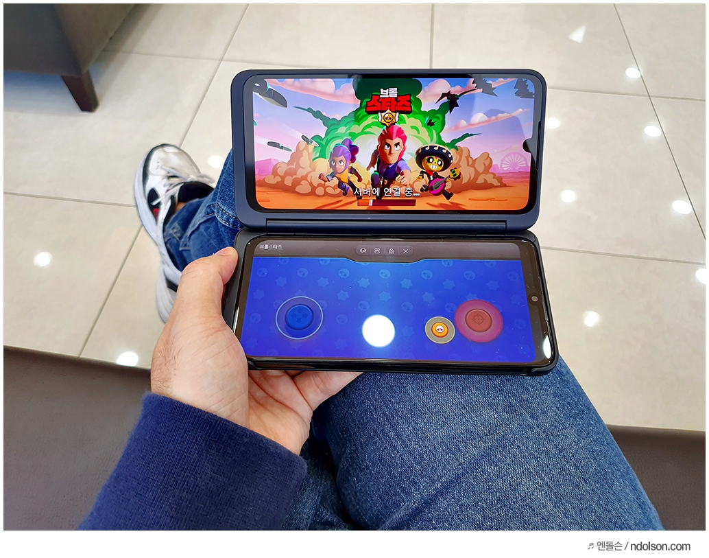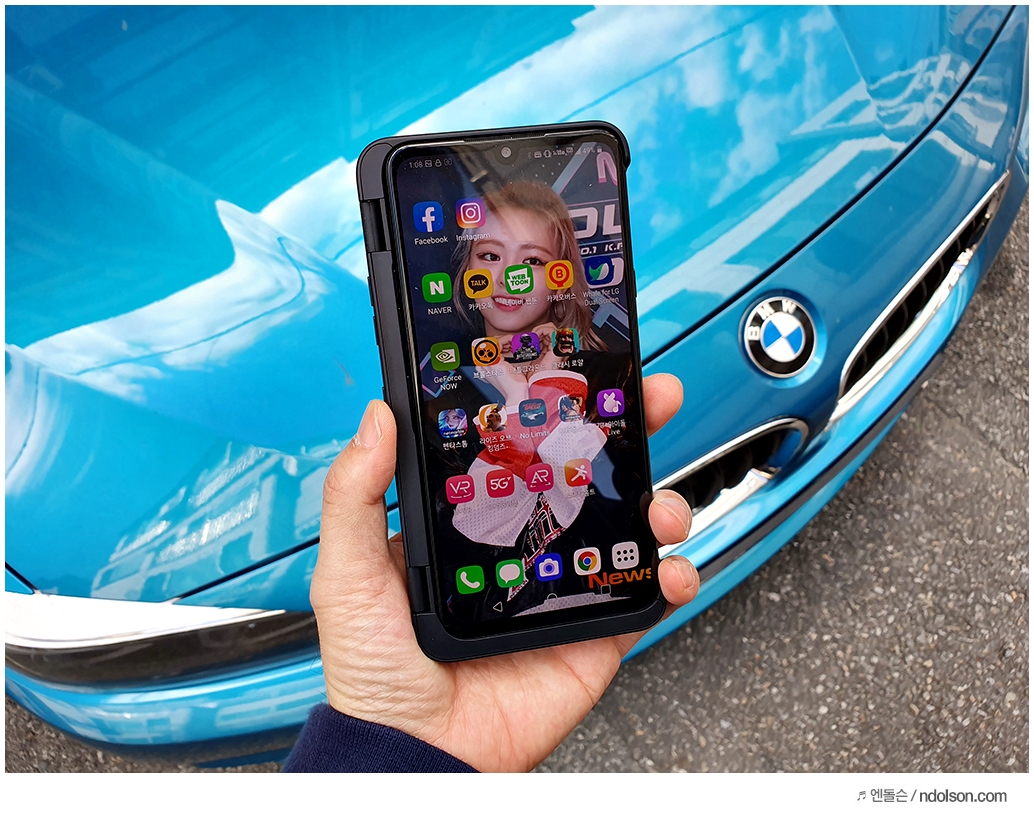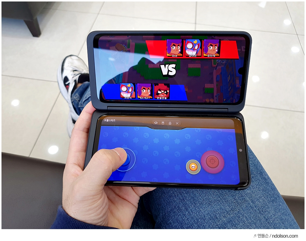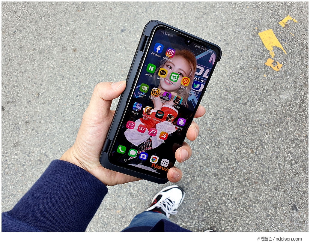 또 재미있는 건 V50S ThinQ의 양쪽 화면을 모두 보이게 해 줄 수 있다는 것입니다. 이건 대박 신기하던데요. 사실 가운데 좀 선이 걸리적거리긴 하지만, 세로 아닌 가로로 두면 또 괜찮습니다.