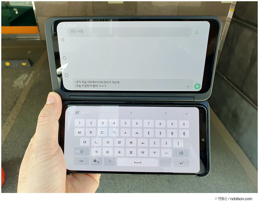 문자 쓸 때도 문자 쓰는 화면을 듀얼로 쓸 수 있습니다. 위에는 화면, 아래는 문자 키보드를 위치하게 하는 것인데요. 키보드는 양쪽으로 나누어서 처리할 수도 있습니다. 작은 화면에 대한 불편함은 없고, 마치 듀얼모니터를 쓰는 기분이라고 할까요?