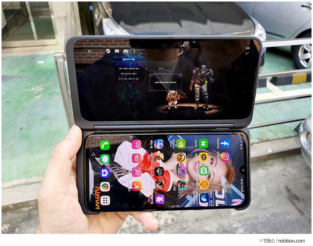 또 재미있는 건 V50S ThinQ의 양쪽 화면을 모두 보이게 해 줄 수 있다는 것입니다. 이건 대박 신기하던데요. 사실 가운데 좀 선이 걸리적거리긴 하지만, 세로 아닌 가로로 두면 또 괜찮습니다.