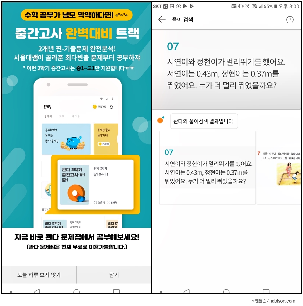 모르는 문제는 퀀다(QANDA) 수학 5초 풀이 검색을 하면 명문대 선생님께 직접 질문하고 취약한 부분의 문제집을 풀어 볼 수 있는 좋은 앱입니다. 세상이 바뀌여서 이제는 카메라로 모르는 수학 문제를 찍으면 되네요.