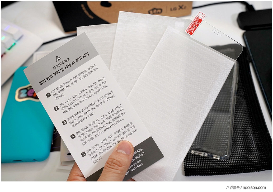 LG X2 잼스마트폰은 아이들이 사용하기 때문에 강화유리를 무려 3개나 같이 넣어 줍니다. 전면 화면의 깨짐 방지를 할 수 있습니다. 또 케이스는 블루, 투명 2개로 줍니다.