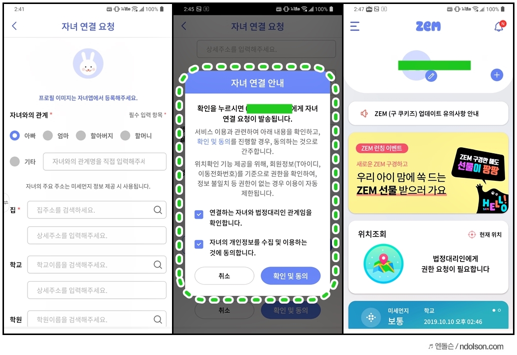 가족 연결을 하면 요청 확인이 오고, ZEM 앱에서 수락을 하면 됩니다. 자녀의 집, 학교, 학원 등의 위치를 등록해두면 위치추적도 가능합니다. 또 급식 등의 정보도 학교정보에서 확인할 수 있습니다.