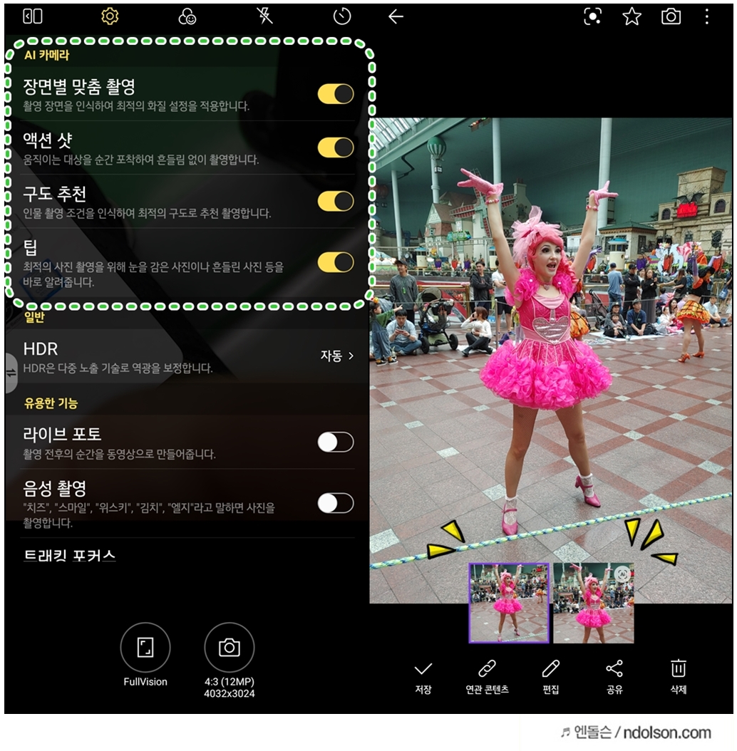 아무래도 인공지능(Ai)이 알아서 장면별 맞춤 촬영과 액션샷, 구도 추천을 하기 때문에 더 좋은 사진을 담을 수 있었습니다. 오른쪽 사진도 흔들림 없이 담아 주었는 데, 액션 샷 기능을 통해서 움직이는 댄서의 움직임을 잡은 사진이 되겠습니다. 옵션을 통해서 찍힌 사진에 Ai가 찍은 사진도 같이 갤러리에서 볼 수 있어 선택적으로 저장할 수 있게 되었습니다.