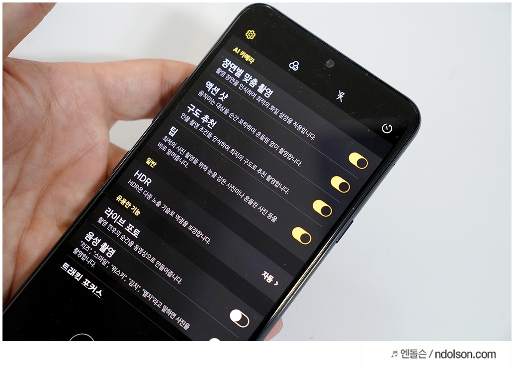 카메라 설정에 보면, 장면별 맞춤 촬영, 액션 샷, 구도 추천, 팁 기능을 켜두었습니다. 인공지능이 알아서 추천된 구도로의 사진을 촬영해줍니다.
