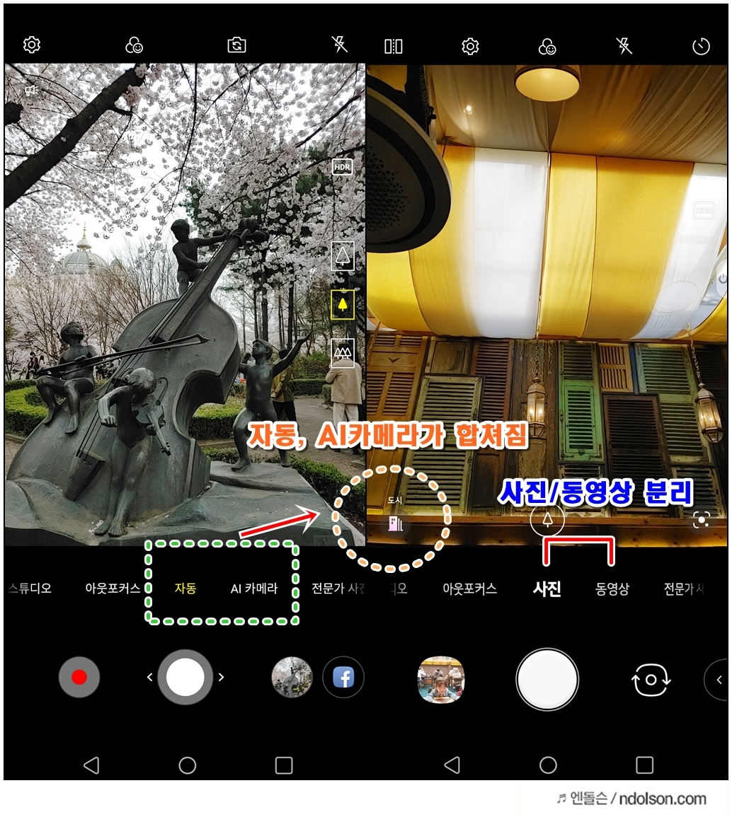 LG V50 씽큐와 V50S 씽큐의 카메라를 비교해보면, UI/UX의 변화를 볼 수 있습니다. 왼쪽 V50은 자동과 AI카메라 따로 있지만, V50S로 오면서 자동은 AI카메라와 합쳐 두었습니다. 또 사진과 동영상은 분리되어 있습니다.