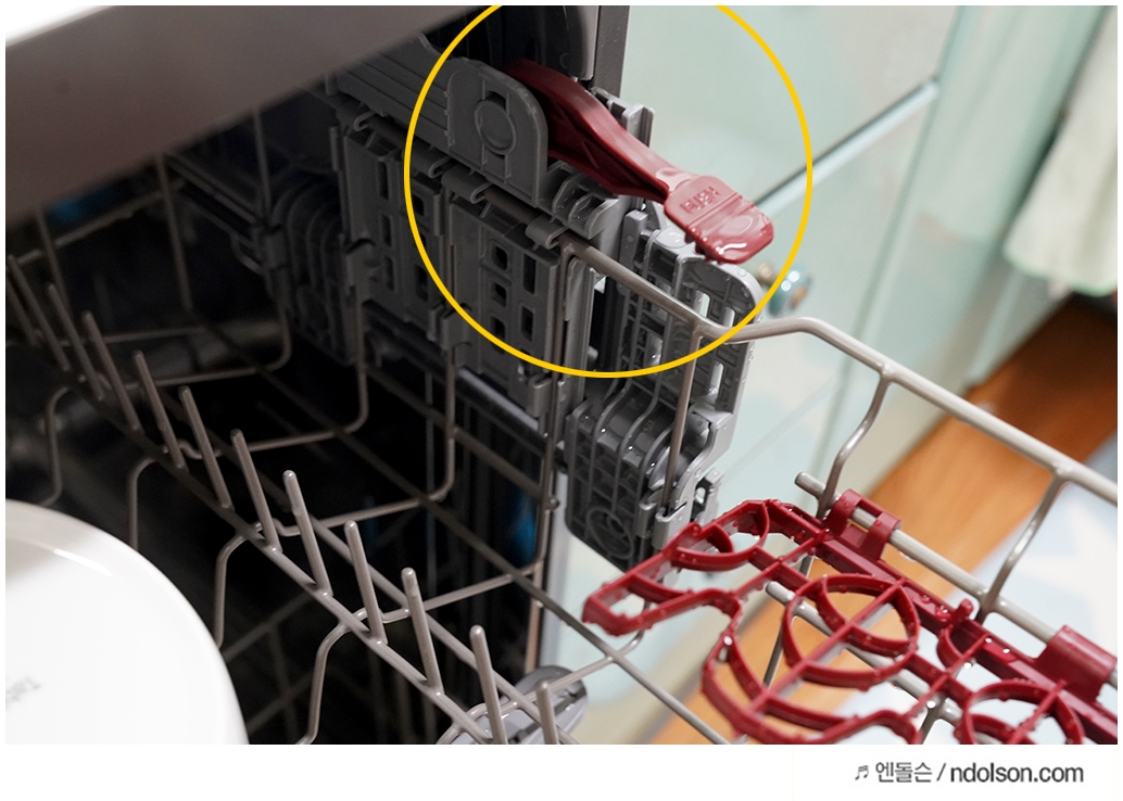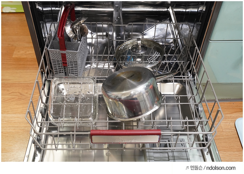 하단에도 물이 분사되는데요. 수저와 젓가락, 국자, 냄비 등의 물건을 넣을 수 있습니다.