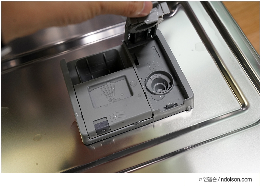식기세척기의 세제를 넣는 투입구입니다. 액체타입과 고체 타입이 있는데요. 헹굼용 린스를 같이 넣어주어야 합니다.