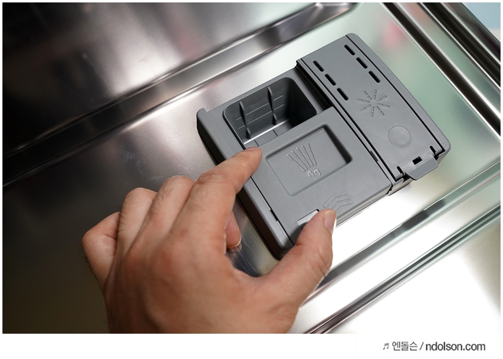 식기세척기의 세제 투입구에 넣고 내려서 락으로 고정해주면 됩니다.