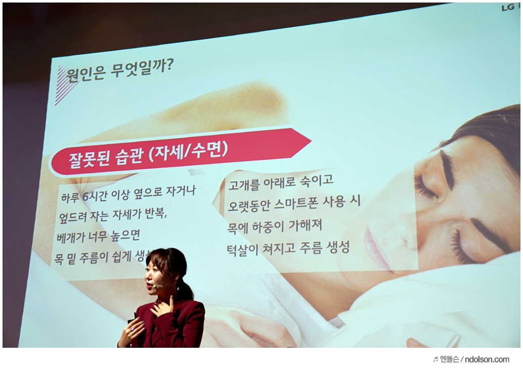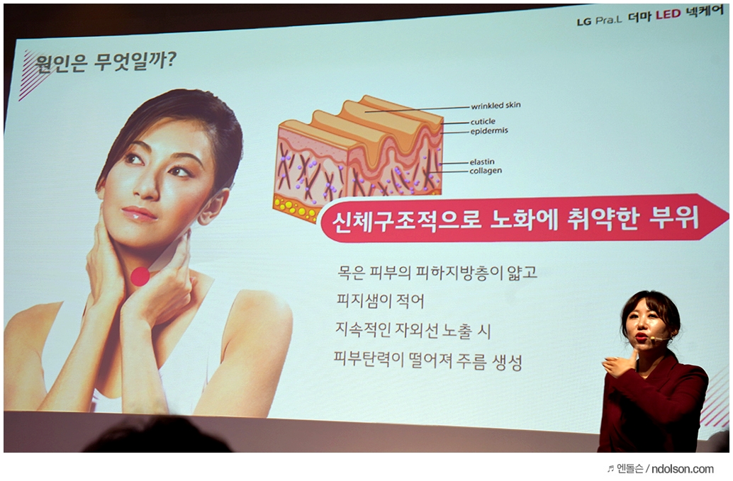 LG전자 관계자의 발표를 통해서 LG전자가 미용에 투자하고 있는 컨셉과 어떤 개선을 위해서 신경 써는지 알 수 있었는데요. 그중에서 나이 들면 특히 목주름에 신경을 많이 쓰는 주변 사람들을 보면서 목주름은 왜 생기는지 궁금하게 되었는데요.