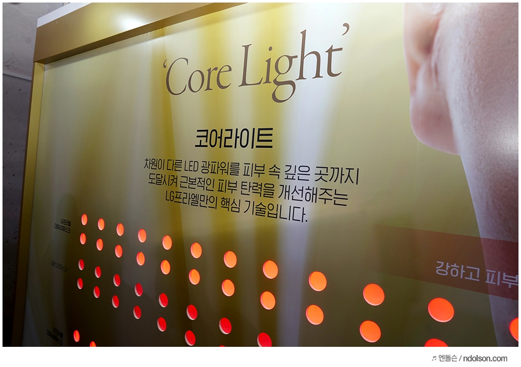 행사 중 가장 많이 들었던 말이 LG 프라엘의 차원이 다른 코어라이트(Core Light)라는 말이었는데요. 일반 LED 와 차별화된 LED 광파워로 피부 속 깊은 곳까지 도달하여 피부 개선을 해주는 핵심 기술이라고 하네요.