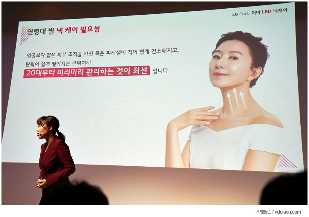피부전문의 강현영님 말처럼 20대는 색조, 30대는 균형, 40대부터는 베이스에 관심이 많다는 것에 공감이 가더군요. 그래서 LG 프라엘 더마 LED 넥케어로 미리 20대부터 관리한 사람이라면 더 좋을 것이라고 이야기하시더라고요.