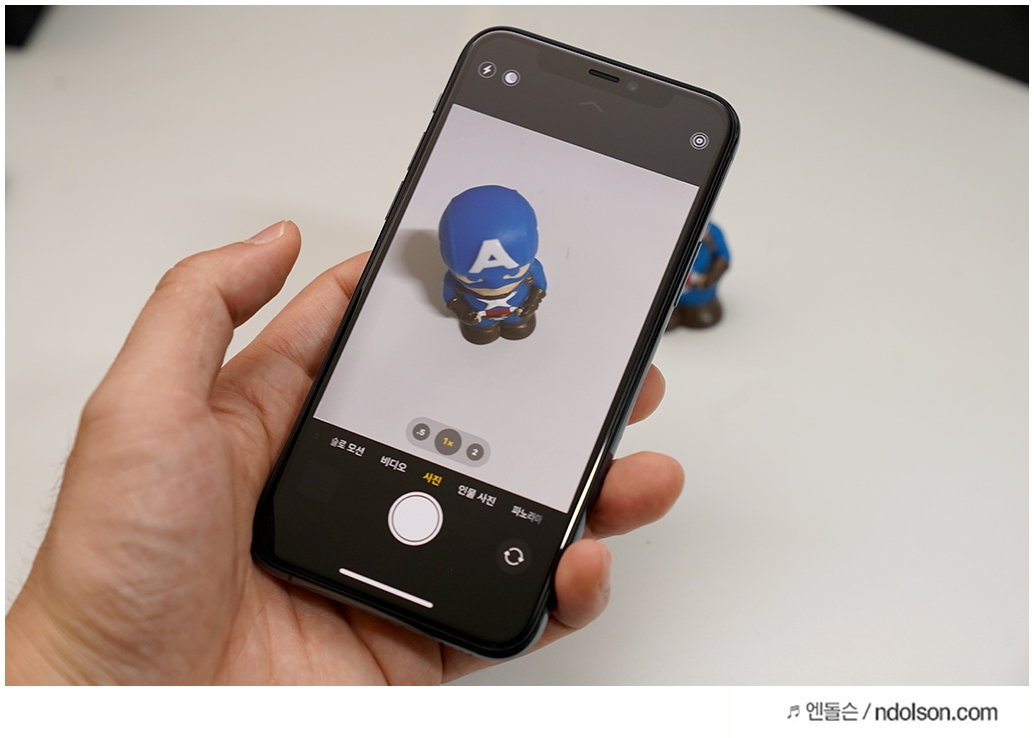 아이폰11의 iOS13 의 UI/UX는 참 깔끔합니다. 이번에 새롭게 추가된 렌즈를 위해서 -5, 1x, 2 (배줌)을 알기 쉽게 구성하였습니다. 또 비디오와 사진이 구분되어 있습니다. 하지만 사진에서도 녹화를 할 수 있는 팁이 있죠.