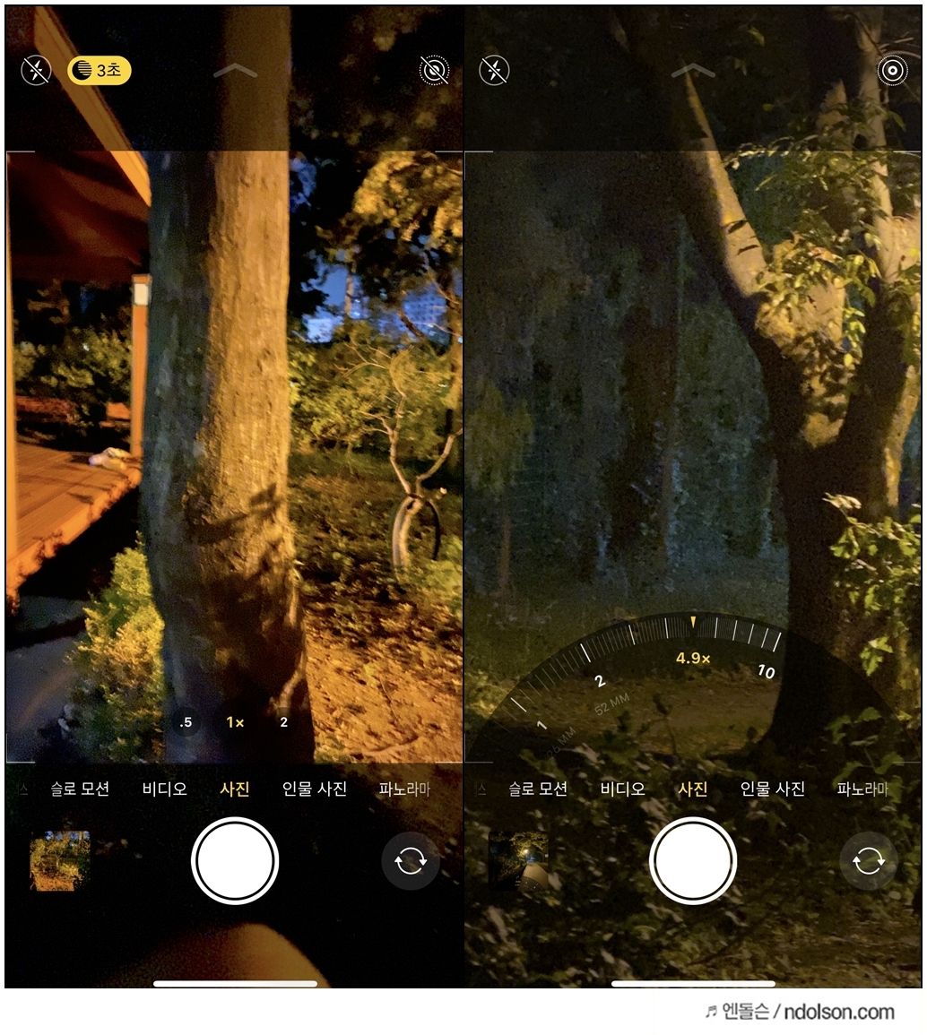 그런데 아이폰11 프로의 카메라는 만능은 아닙니다. 그렇지만, 야간 사진이 잘나오게 특별한 설정을 하였습니다. 노출을 늘리기 위해서 어두운 야간 사진 촬영 시 노출타이머가 설정됩니다. 설정은 끌 수 있지만, 시간동안 유지하면, 화질이 개선된 야간 사진을 얻을 수 있습니다.
